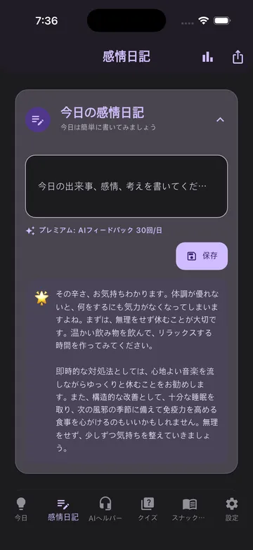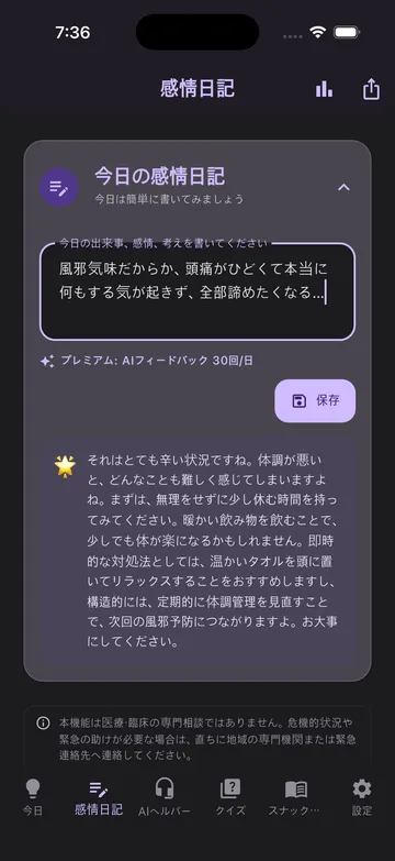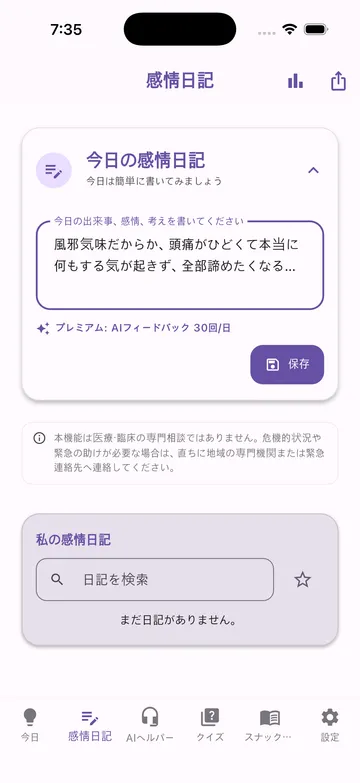 感情記録、AI補助、短い心理学学習を1つのアプリで。