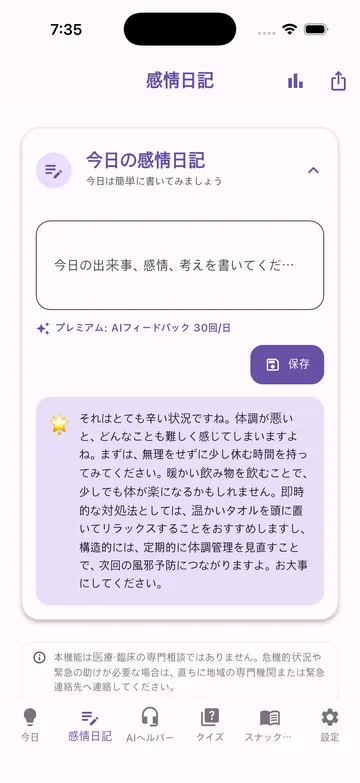 感情記録からAI補助フィードバック、短い心理学学習まで。忙しい毎日でも続けやすい設計です。