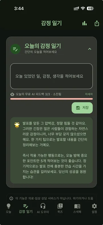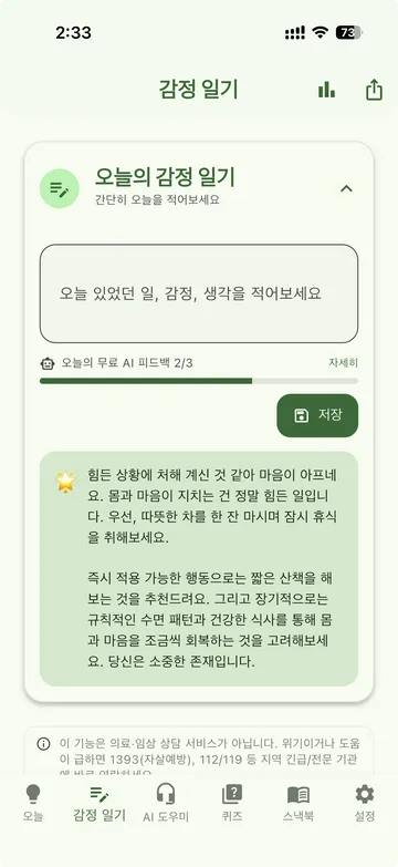 감정 일기에서 AI 보조 피드백, 심리학 학습까지. 바쁜 일상에도 이어지는 가벼운 마음 루틴.